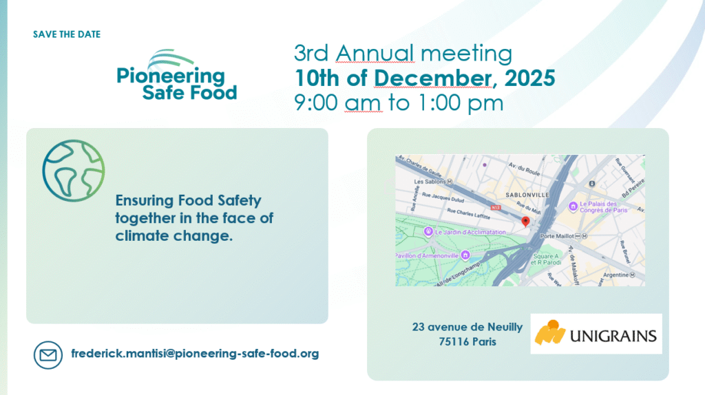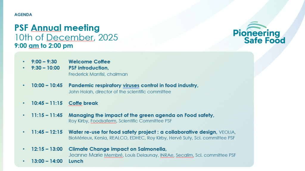 On December 10, 2025, from 9 a.m. to 1 p.m., the association will hold its 3rd meeting in Paris, at the UNIGRAIN headquarters. We will welcome two new members: VEOLIA and BioMérieux. This will be the opportunity to present an initial project aimed at anticipating disinfection in the food industry during a future zoonosis. The co-development of a project aimed at rethinking water use in the food industry will be presented with the first participants. Roy Kirby will present how to manage the impact of a responsible approach on food safety. Finally, INRAE/Oniris will present their work on the impact of climate change on salmonella.